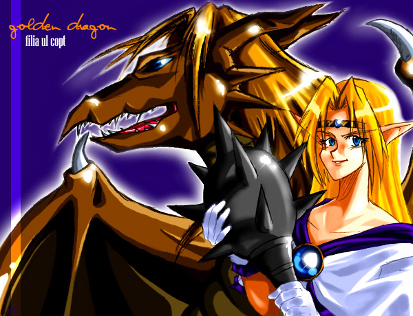 A gorgeous, colored fanart of Filia Ul Copt, with her dragon form in the background. |