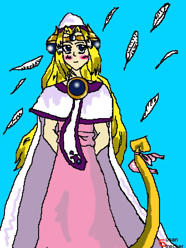 A beautifully colored, computer-drawn fanart of Filia, with feathers floating behind her. |